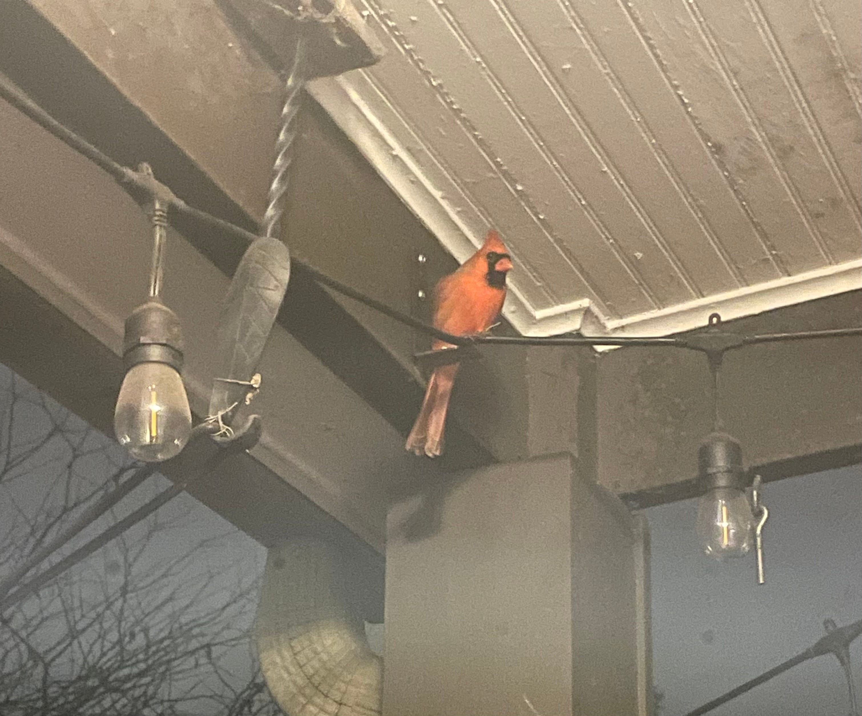 The cardinal has shown up again on the back porch. I find him early mornings in cold weather, and it always startles me. The black, unblinking eyes. How still he is. Is he dead? is what I always think. But no. He’s just perched there, half scary looking and half comical. He watches me let the dog out and watches me letting the dog back in. I wonder what he is thinking. Am I an enemy to him?