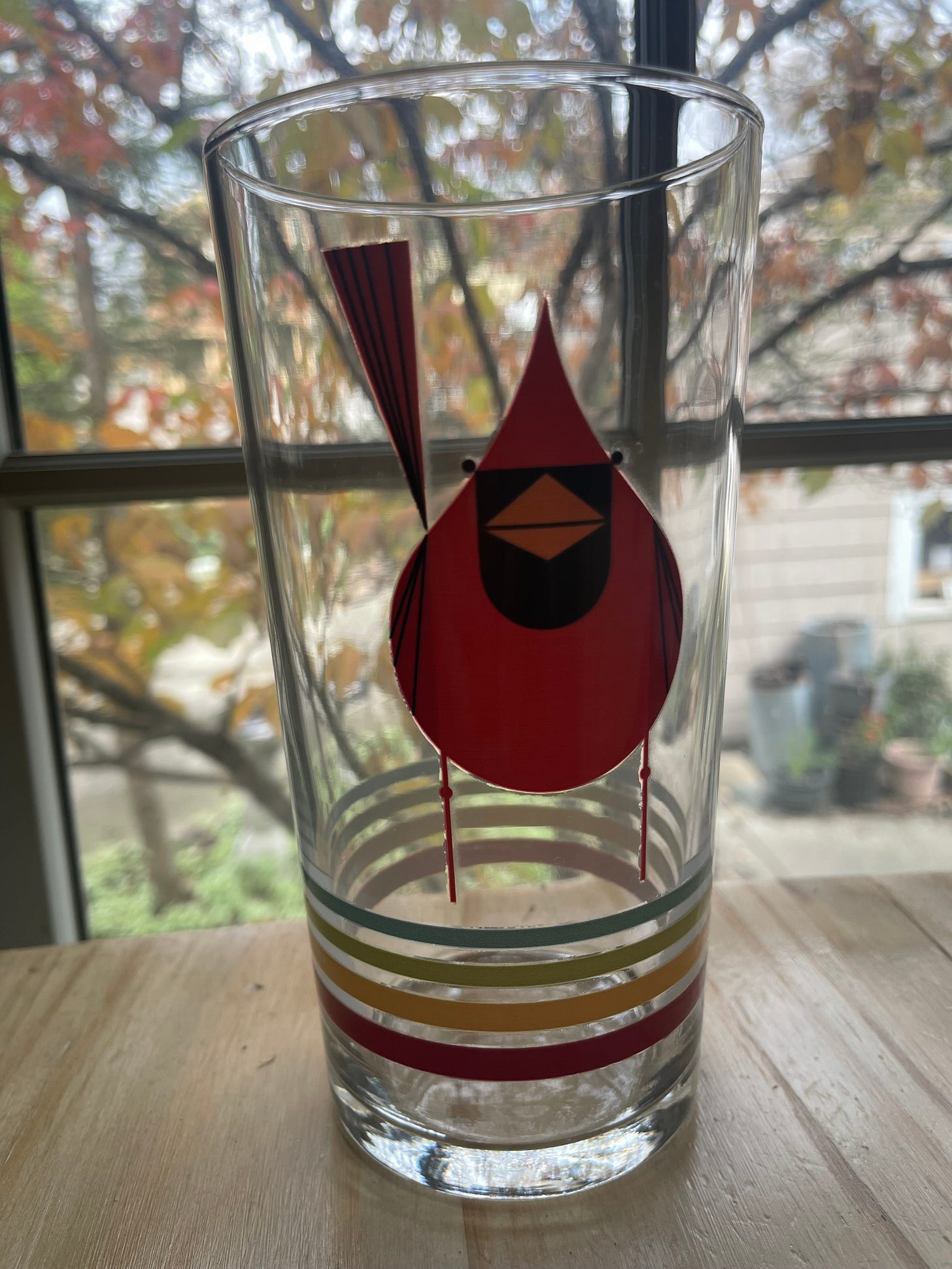 A couple of months ago my husband and I went to the museum and at the end of our visit browsed the gift shop, pausing by a display of Charley Harper merch. Colorful prints and notecards, a set of drinking glasses, each featuring a cardinal, $15.95 a piece. Pricey for a glass, but these were so cool-looking and reminded us of the cardinal on the back porch.