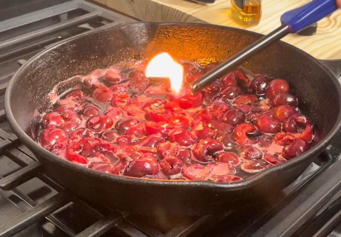 I wanted to light the cherries on fire, but it turns out I'd bought the wrong kind of accelerant. The recipe called for cherry brandy, but I'd substituted cherry whiskey, and apparently cherry whiskey does not ignite. So, that was a big bummer. The dessert (cherry cheesecake bars) still ended up being delicious. Also, the lemon cookies.